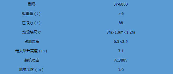 地埋式垃圾中轉(zhuǎn)站主要特點(diǎn):1.平穩(wěn)可靠:兩側(cè)舉升,剪叉跨度大,升降平穩(wěn),無傾斜。2.全封閉水平壓縮:垃圾壓實(shí)密度≧0.86t/m,大幅度節(jié)約轉(zhuǎn)運(yùn)成本。3.淺地坑:地坑深度僅為1.55m,保潔及維修極為方便。4.高效率:壓實(shí)每噸垃圾時(shí)間≤10min。 主要技術(shù)參考:型號(hào)JY-6000載重量(t)>6圧縮力(t)88垃圾塊尺寸3m1.9m1.2m...
